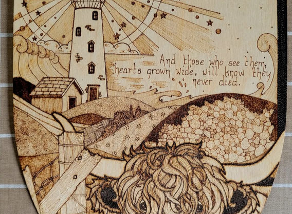 I am a local artist living in Stornoway, Isle of Lewis. My main medium is pyrography and I have been creating in this medium in my business since 1987. I also create using mixed media and I am inspired by Island and Scottish mythology and folklore, the Scottish natural world and history. I enjoy the use of symbolism in my work to build up individual and personal pieces. Each piece I create is unique and I welcome commissions. I work with seasoned wood sourced from the Lews Castle Grounds and from the beaches around our islands. I also enjoy making up 3D pieces from special pieces of wood that I find.